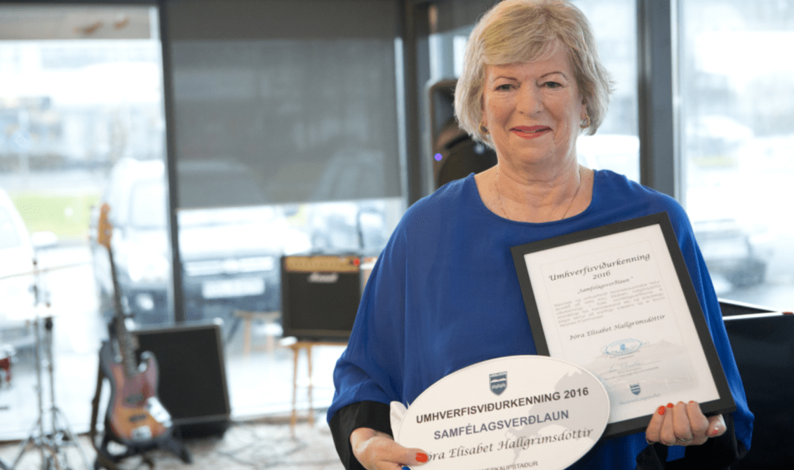 Þóra Beta fékk á dögunum samfélagsverðlaun og viðurkenningu frá Akraneskaupstaðar fyrir framúrskarandi elju og þrautseigju þegar kemur að snyrtingu bæjarins og segir í umsögn ráðsins að hún sé ,,sannarlega íbúum Akraness til fyrirmyndar“