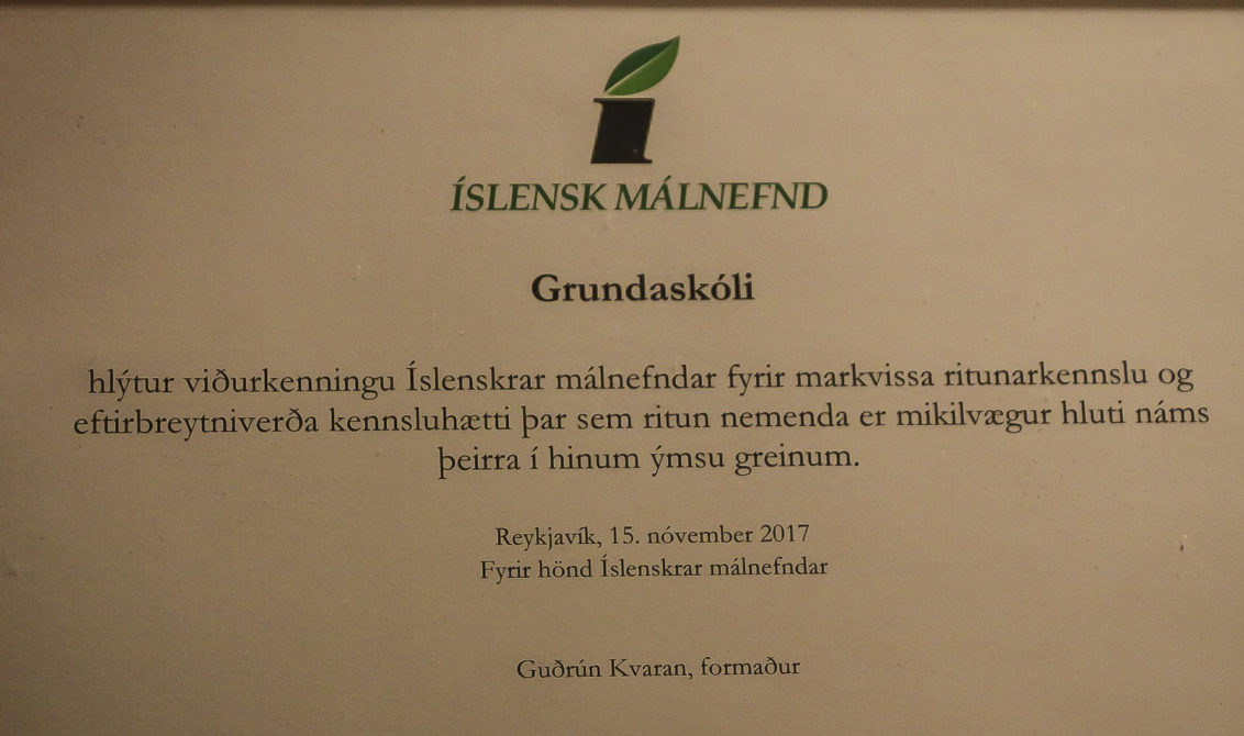 „Grundaskóli hlýtur viðurkenningu Íslenskrar málnefndar fyrir markvissa ritunarkennslu og eftirbreytniverða kennsluhætti þar sem ritun nemenda er mikilvægur hluti náms þeirra í hinum ýmsu greinum.“