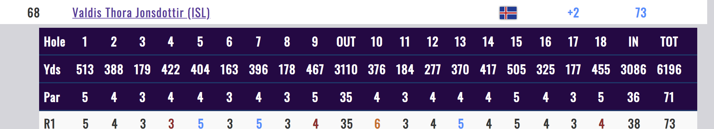 Valdís Þóra lék á +2 á fyrsta hringnum. Hún lék fyrri 9 holurnar á pari þar sem hún fékk tvo fugla (-1) og tvo skolla (+1). Á síðari 9 holunum fékk Valdís einn skramba (+2), einn skolla (+1) og einn fugl (-1).