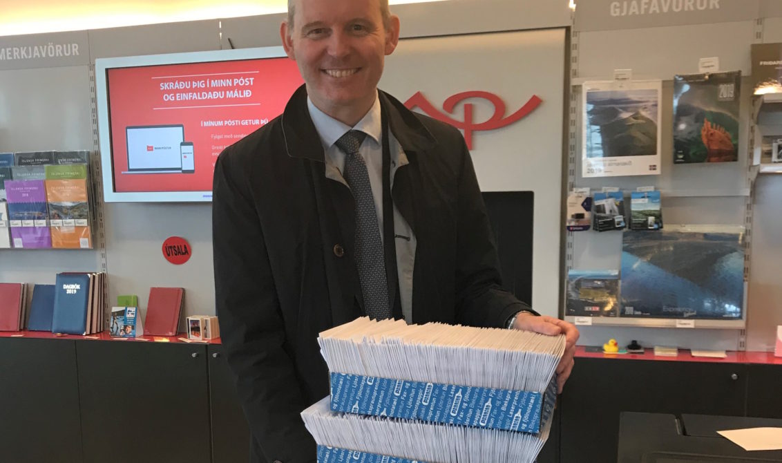 Sævar Freyr Þráinsson, bæjarstjóri Akraness, er einn af stofnendum Hollvinasamtaka HVE. Hér er hann með um 900 bréf sem fóru í pósti til fyrirtækja á Vesturlandi nýverið.