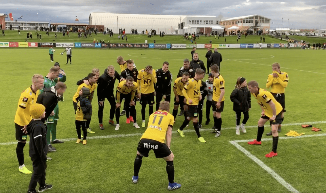 Gleðin var einlæg í leikslok eins og sjá má í þessu myndbandi.