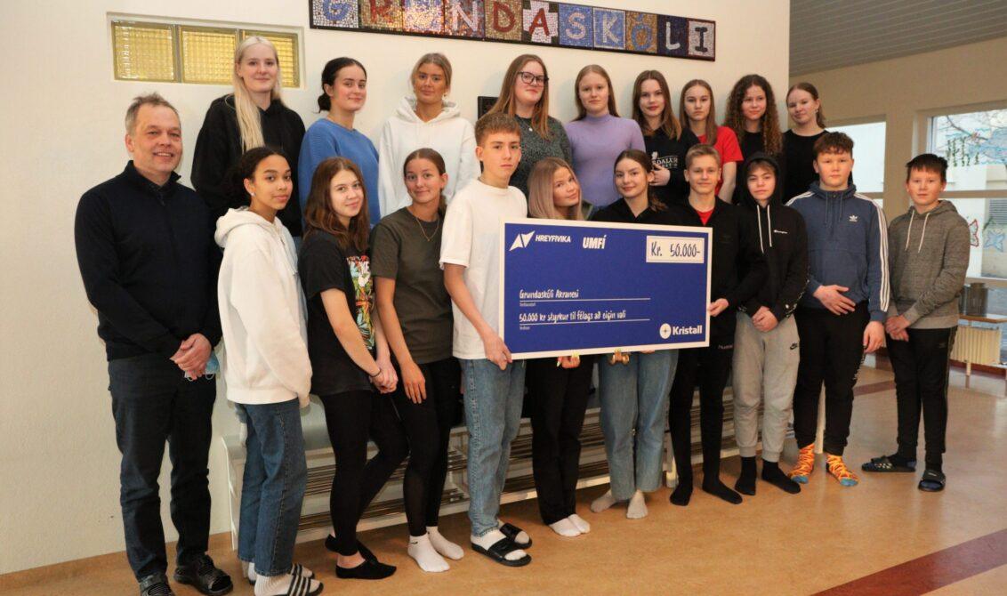 Auður Inga Þorsteinsdóttir, framkvæmdastjóri UMFÍ, afhenti nemendum Grundaskóla 50.000 kr. ávísun. Sú krafa er á verðlaununum er að vinningshafar þurfa að láta hana af hendi til góðra verkefna.