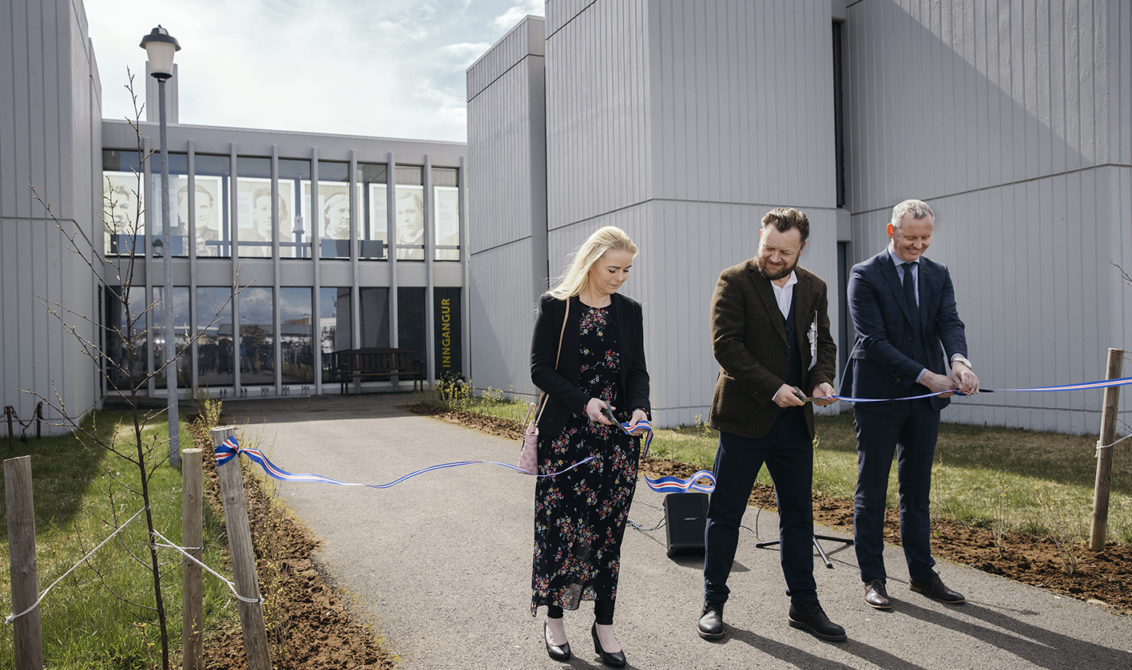 Sævar Freyr Þráinsson bæjarstjóri á Akranesi, Linda Björk Pálsdóttir sveitarstjóri Hvalfjarðarsveitar og Ólafur Páll Gunnarsson formaður menningar- og safnanefndar klipptu á borða við opnun sýningarinnar.