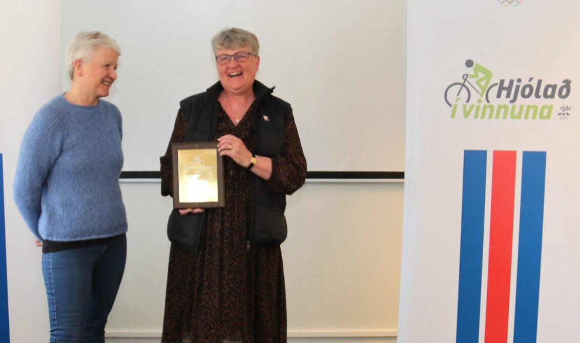 Á meðfylgjandi mynd eru Margrét Þorvaldsdóttir og Katrín Leifsdóttir starfsmenn Grundaskóla sem unnu í flokki 70-129 starfsmenn. Katrín heldur á verðlaununum en hún hefur verið forsprakkinn í Hjólað í vinnuna átakinu í Grundaskóla í fjöldamörg ár en skólinn hefur unnið átakið í þessum flokki þó nokkrum sinnum. Nú fer hún á eftirlaun en treystir á samstarfsfólkið til þess að halda heiðri Grundaskóla á lofti. Starfsfólk Hjólað í vinnuna þakkar henni fyrir að vera mikill drifkraftur fyrir átakið úti í samfélaginu.