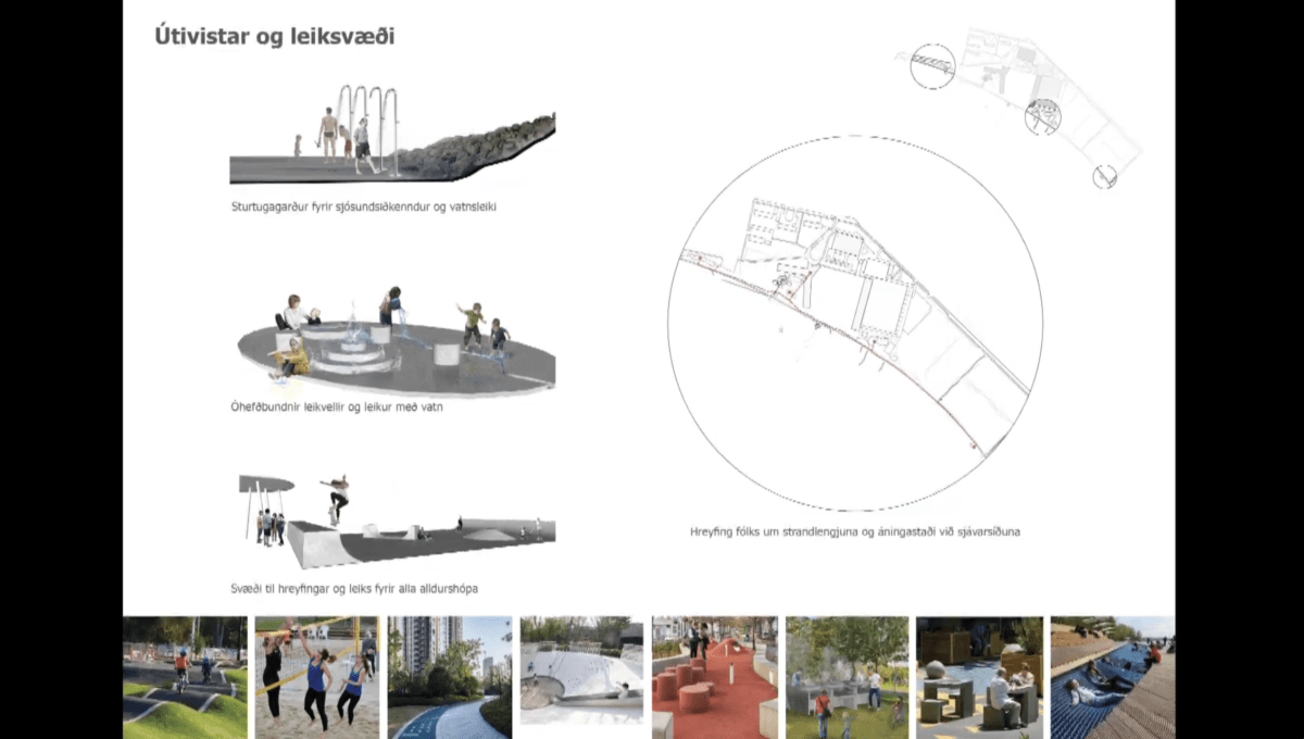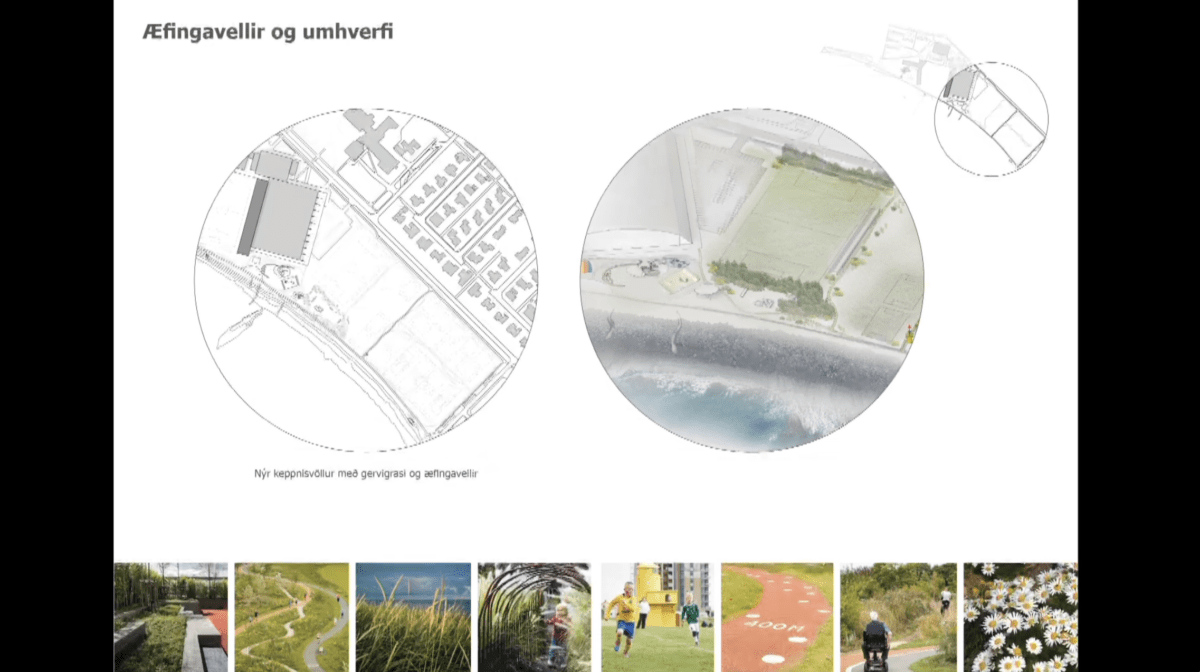 Nordic arkitektar, Basalt arkitektar og Sei arkitektar, kynna þar tillögur sínar að breyttu skipulagi Jaðarsbakkasvæðisins. Í tveimur tillögum af þremur er gert ráð fyrir að Akranesvelli verði snúið um 90 gráður, áhorfendaaðstaða flutt samhliða Akraneshöll.