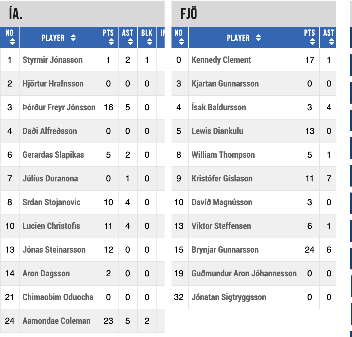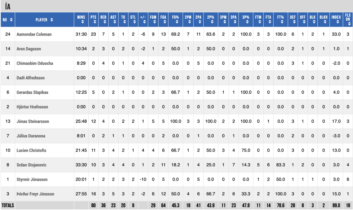 Aamondae Coleman skoraði flest stig fyrir ÍA eða 23 alls, hann tók 7 fráköst og gaf 5 stoðsendingar. Þórður Freyr Jónsson skoraði 16 stig, Jónas Steinarsson skoraði 12 og Srdan Stojanovic var með 10 stig.