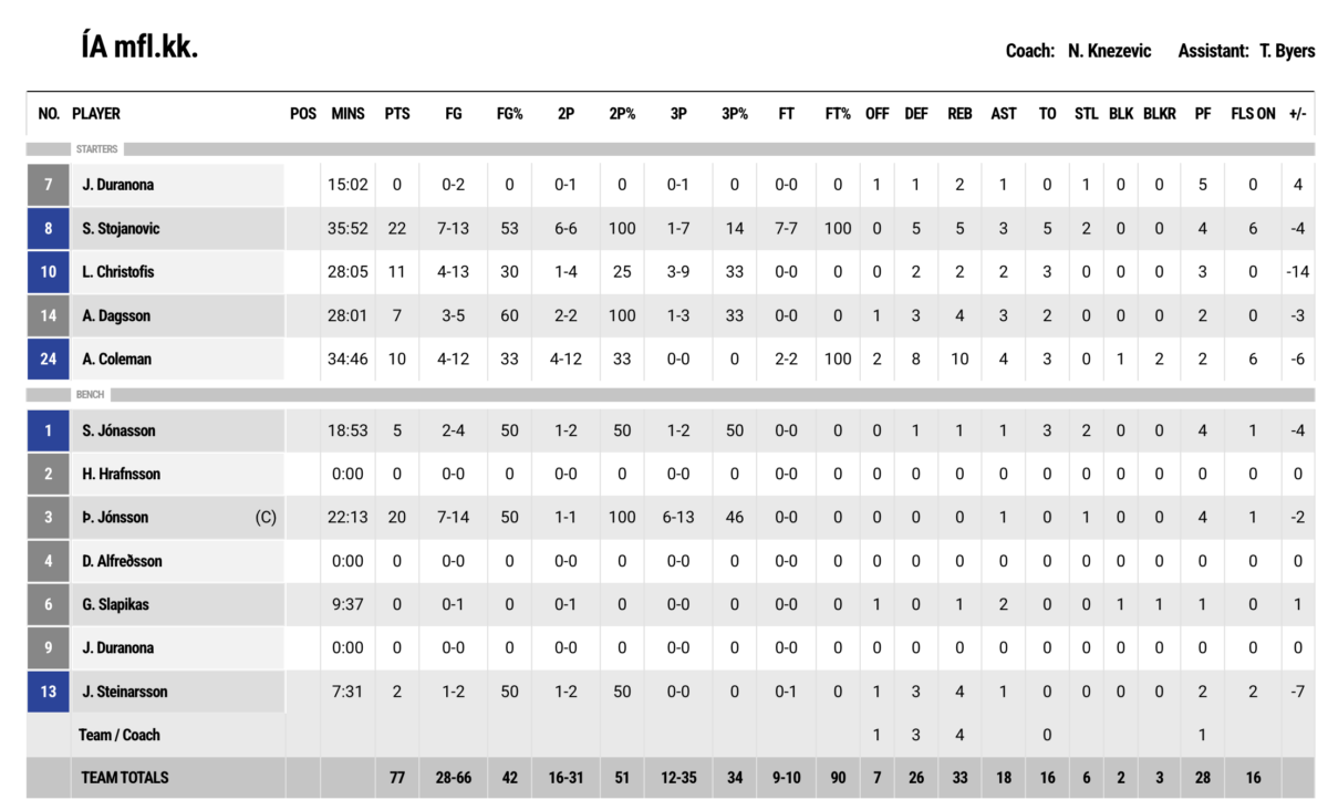Srdan Stojanovic skoraði 22 stig fyrir ÍA og tók 5 fráköst, Þórður Freyr Jónsson skorði 20 stig, Lucien Christofis skoraði 11 stig og Aamondae Coleman var með 10 stig og 10 fráköst.
