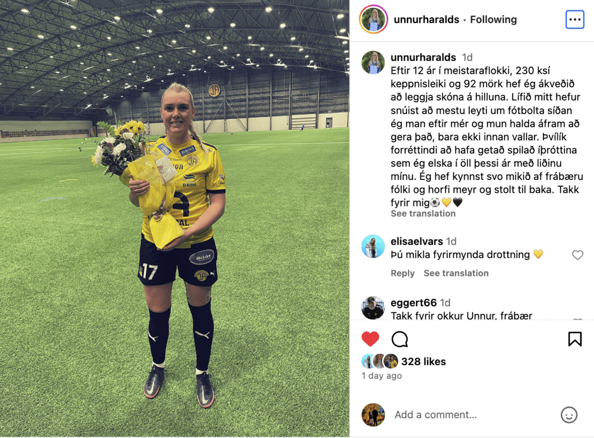 „Lífið mitt hefur að mestu leyti snúist um fótbolta síðan ég man eftir mér og mun halda áfram að gera það, bara ekki innan vallar. Þvílík forréttindi að hafa getað spilað íþróttina sem ég elska í öll þessi ári með liðinu mínu. Ég hef kynnst svo mikið af frábæru fólki og horfi meyr og stolt til baka. Takk fyrir mig,“ skrifar Unnur Ýr á Instagram síðu sína.