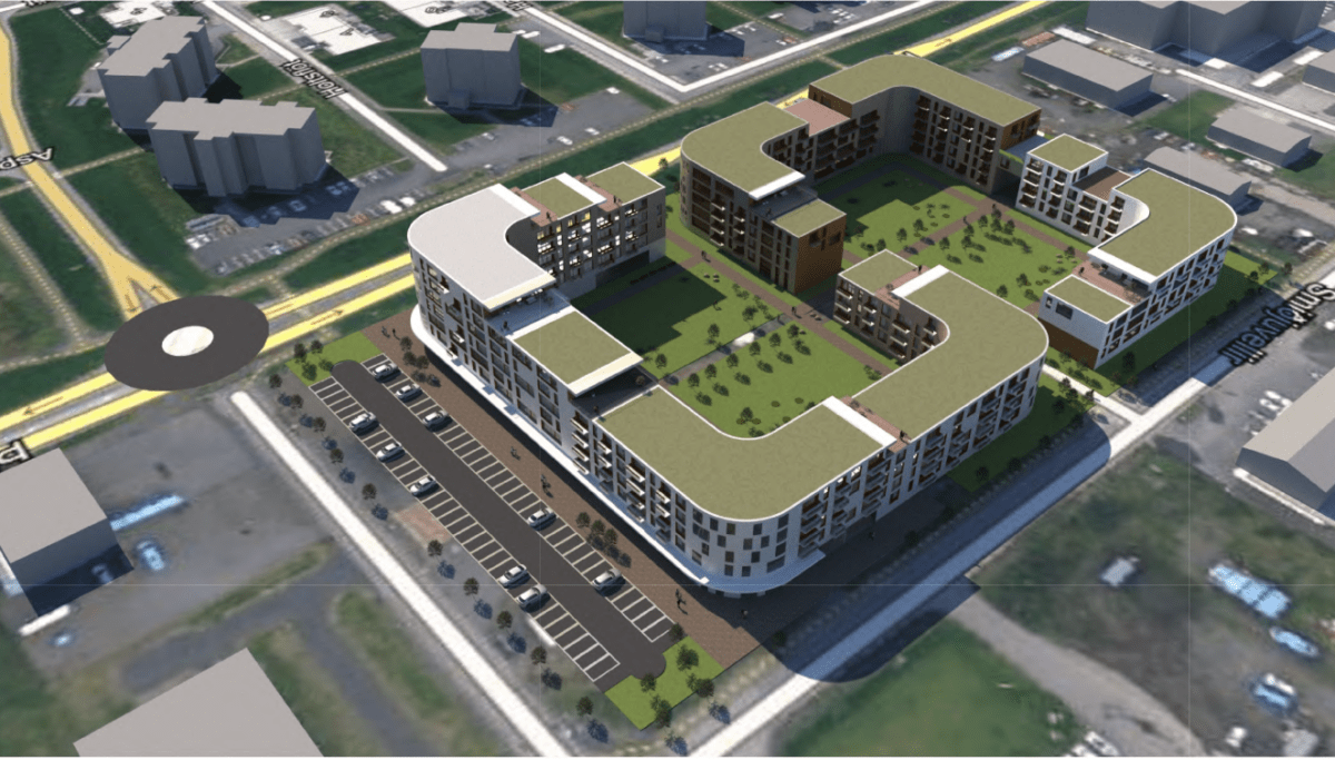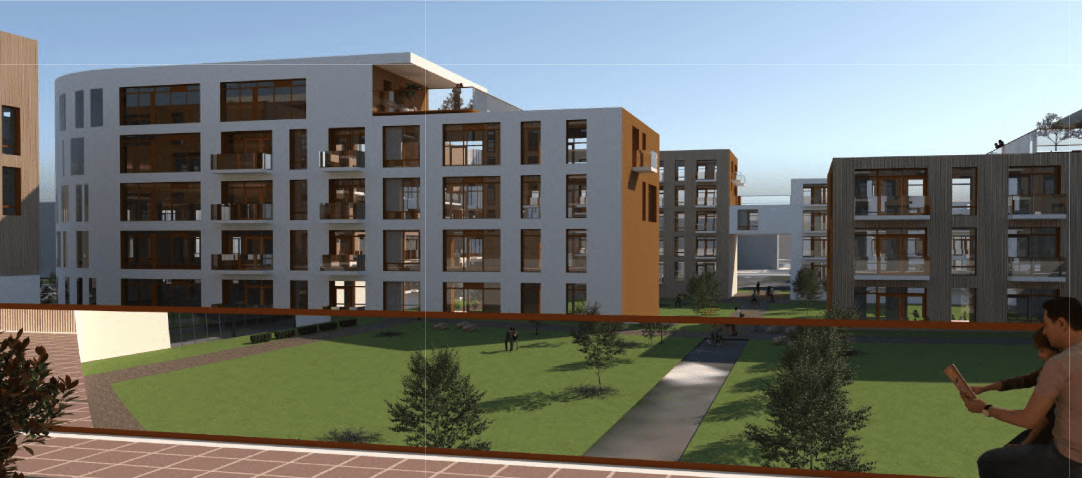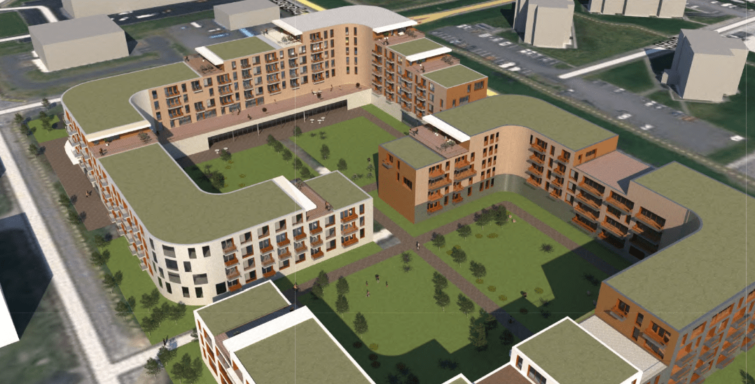 Hér fyrir neðan eru skýringarmyndir á fyrirhugaðri byggingu – en á þessu svæði var einbýlishús og gróðurstöð. Miðað við áætlanir og nýtt skipulag verður iðnaðarhús með sex innkeyrsludyruym sem stendur á lóðinni rifið.