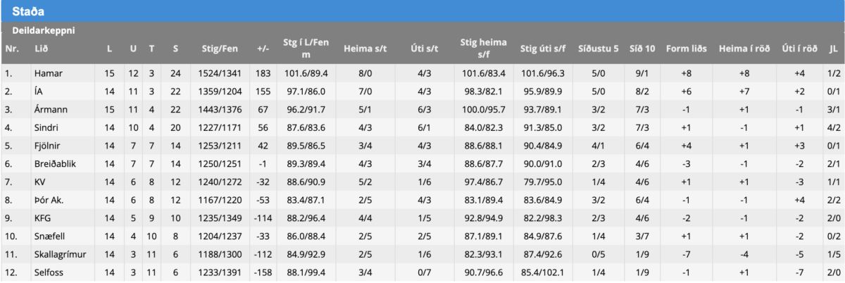 ÍA er með 22 stig að loknum 14 umferðum en liðið hefur unnið 11 leiki og aðeins tapað 3 leikjum það sem af er. Hamar frá Hveragerði er í efsta sæti með 24 stig en Hamar hefur leikið einum leik meira en ÍA.