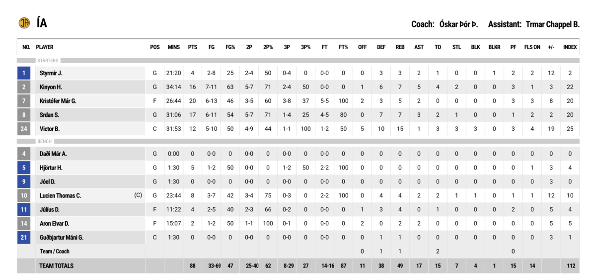 Kristófer Gíslason var stigahæstur í liði ÍA með 20 stig. Srdan Stojanovic var með 17 stig og miðherjinn Victor Bafutto var atkvæðamikill með 12 stig og 15 fráköst. Kinyon Hodges skoraði 16 stig og tók 7 fráköst.