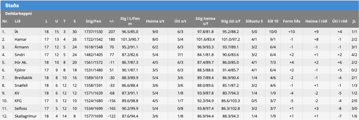 Skagamenn eru því í dauðafæri að tryggja sér sæti í efstu deild – en það lið sem endar í efsta sæti eftir deildarkeppnina fer beint upp í Bónus-deildina á næsta tímabii, en liðin í sætum 2-9 leika í úrslitakeppni um eitt laust sæti til viðbótar í efstu deild á næsta tímabili.