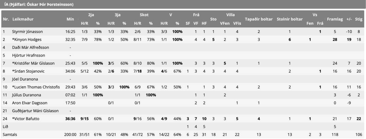 Victor Bafutto skoraði 22 stig fyrir ÍA og tók 10 fráköst, Kristófer Már Gíslason skoraði 20 stig og Srdan Stojanovic var einnig með 20 stig. Kinyon Hodges skoraði 18 stig, stal 6 boltum og gaf 5 stoðsendingar.