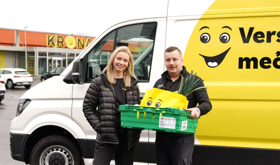 Guðrún, framkvæmdastjóri Krónunnar og Sigurður, verslunarstjóri Krónunnar á Akranesi skjótast með sendingar til Skagamanna á rafmagnsbíl fyrirtækisins. Mynd: Rúnar Kristmannsson