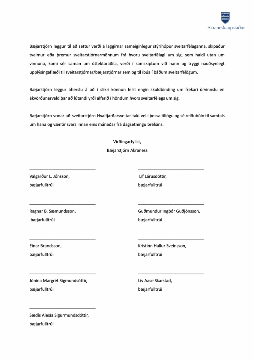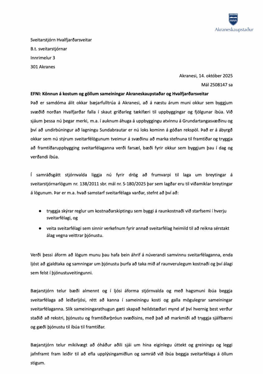Bæjarráð samþykkti á fundi sínum þann 9. október 2025 að leggja til við bæjarstjórn að senda sveitarstjórn Hvalfjarðarsveitar formlegt erindi þar sem lagt yrði til að sveitarfélögin setji á laggirnar stýrihóp sem taki saman eða láti taka saman greiningu á kostum og göllum þess að sveitarfélögin sameinist.