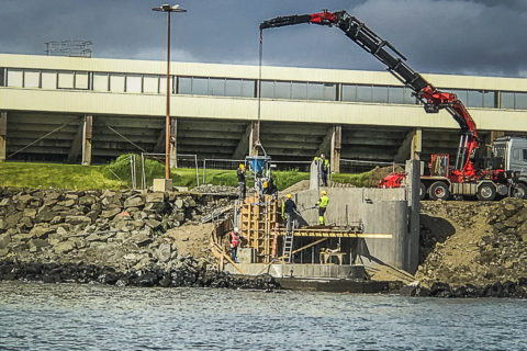 Guðlaugin rís upp úr brimvarnargarðinum við Langasand