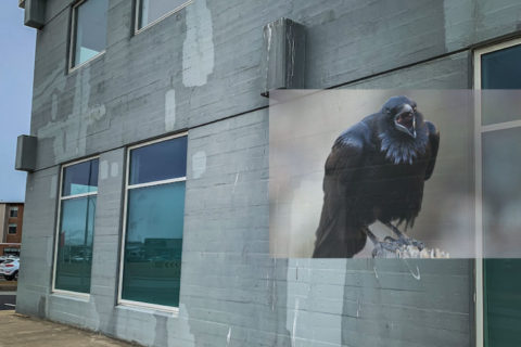 Krummi í „hreiðurgerð“ á gaflinum á „gamla ríkinu“