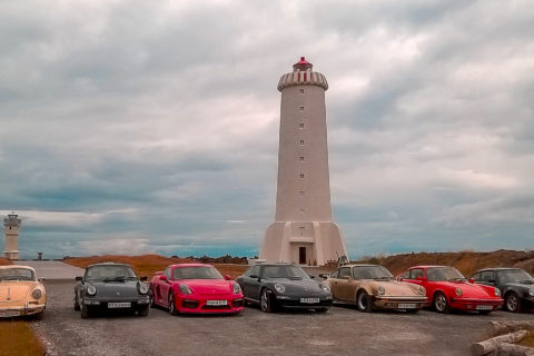 Glæsilegt safn af Porsche bílum við Akranesvitann