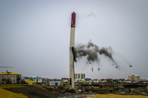 Myndasyrpa frá fellingu strompsins – gríðarlegt fjölmenni fylgdist með