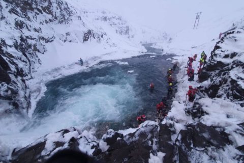 Sjö frá Björgunarfélagi Akraness við leit að piltinum sem féll í Núpá