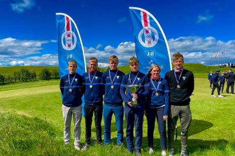 Golfklúbburinn Leynir frá Akranesi fagnaði sigri á Íslandsmóti golfklúbba 18 ára og yngri í drengjaflokki. Leynir sigraði Golfklúbb Mosfellsbæjar, GM, í úrslitaleiknum sem fram fór í dag á Strandarvelli á Hellu. Frá vinstri: Nói Claxton, Bragi Friðrik Bjarnason, Kári Kristvinsson, Tristan Freyr Traustason, Elsa Maren Steinarsdóttir, Björn Viktor Viktorsson, liðsstjóri. Mynd/golf.is/BEG Leynir sigraði GM í...